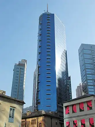 The Centrium (Chinese: 中央廣場) is a skyscraper located in the Central district of Hong Kong. The tower rises 41 floors and 189 metres (620 ft) in height.[2] The building was completed in 2001.[1] It was designed by architectural firm DP Architects, and was developed by the Sino Group Limited.[2] The Centrium, which stands as the 75th-tallest building in Hong Kong, is composed almost entirely of commercial office space; the lowermost floors are used for retailing.[1] It has a total floor area of 23,775 square metres (255,900 sq ft).[1] A spire was added to the building in 2002, one year after its initial completion; the spire lights up in various colors at night.[2]