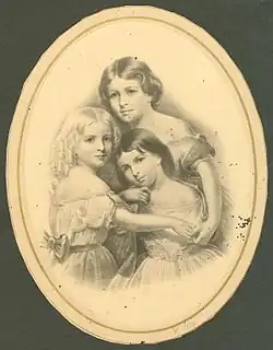 "The Children's Hour" was included in the Birds of Passage section at the end of the 1863 collection Tales of a Wayside Inn.[2] Longfellow's publisher James T. Fields was enthusiastic about the poem, noting that it would be adored by "the parental public".[3] A group portrait of the three Longfellow daughters by Thomas Buchanan Read was widely reproduced and distributed along with the poem. A copy of the print was found near the body of a soldier at the American Civil War Battle of Gettysburg after the July 1 – July 3, 1863 battle, now held by the Maine Historical Society.[4] In 1883, a year after the poet's death, a tableau vivant was staged titled Longfellow's Dream and featured his life and works, including "The Children's Hour".[5]