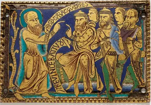 Paul arguing with Jews, 12th-century champlevé enamel plaque – DISPVUTABAT CV[M] GRECIS (He disputed with the Greeks) REVINCEBAT IV[DEOS] (He refuted the Jews)
