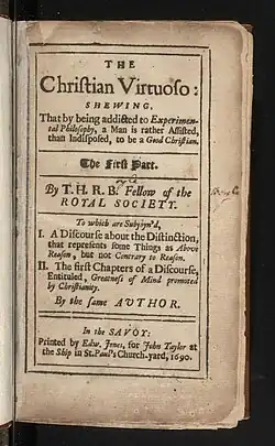 The Christian Virtuoso (1690) was one of the last books published by Robert Boyle,[1] who was a champion of his Anglican faith. This book summarised his religious views,[2] including his idea of a clockwork universe created by God.[3][4] Boyle was a devout Anglican, and with the rise of science and reason during his lifetime, was troubled by increasing atheism. This spurred him to write about his belief of science and religion supporting each other.[5]