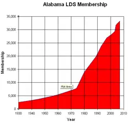 Official church membership as a percentage of general population was 0.75% in 2014. According to the 2014 Pew Forum on Religion & Public Life survey, 1% of Alabamians identify most closely with The Church of Jesus Christ of Latter-day Saints.[3] The LDS Church is the 10th largest denomination in Alabama.[4]