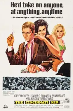 The script, adapted from Richard Jessup's 1963 novel of the same name, was written by Ring Lardner Jr. and Terry Southern; it was Lardner's first major studio work since his 1947 blacklisting as one of The Hollywood Ten.[4] The film stars Steve McQueen in the title role and Edward G. Robinson as Howard. Director Jewison, who replaced Sam Peckinpah shortly after filming began,[4] describes The Cincinnati Kid as his "ugly duckling" film. He considers it the film that allowed him to make the transition from the lighter comedic films he had been making and take on more serious films and subjects.[5]