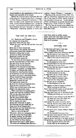 An early version of the poem, titled "The Doomed City", appeared in Poe's 1831 collection simply called Poems.[7] It was reworked, as many of Poe's works, and published in the Southern Literary Messenger in August 1836 as "The City of Sin". It was first printed under the title "The City in the Sea" in the April 1845 issue of the American Review. The poem also appeared in the Broadway Journal, in the August 30, 1845 issue. It was included by Rufus Wilmot Griswold in the tenth edition of The Poets and Poetry of America in 1850, the year after Poe's death, as an example of Poe's best poetry.[8]