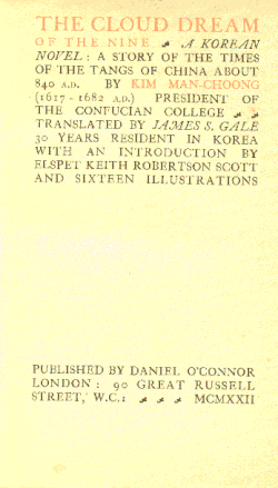 - ^ Yetts, W. Perceval (April 1925). "The Cloud Dream of the Nine. By Kim Man-choong. Translated by J. S. Gale. 8¾ × 5½, 307 pp. + 16 illustrations. London : D. O'Connor, 1922". Journal of the Royal Asiatic Society. 57 (2): 355–356. doi:10.1017/S0035869X00068982. ISSN 2051-2066. S2CID 163078843.