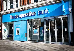 The Co-operative Bank p.l.c.[1] is a British retail and commercial bank based in Manchester, England. Established as a bank for co-operators and co-operatives following the principles of the Rochdale Pioneers, the business evolved in the 20th century into a mid-sized British high street bank, operating throughout the UK mainland. Transactions took place at cash desks in Co-op stores until the 1960s, when the bank set up a small network of branches that grew from six to a high of 160; in 2023 it had 50 branches.