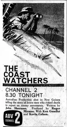 The Coastwatchers is a docudrama television film about coastwatchers made in 1959 by producer Roger Mirams for Pacific Films. It starred Ken Goodlet and Kevin Colson and was written by John Sherman and directed by Mirams.[6][5]