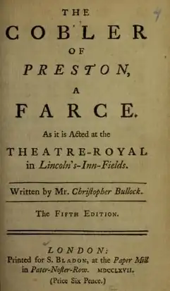 The Cobbler of Preston (first published as The Cobler of Preston) is a 1716 comedy play by Christopher Bullock, although a separate play of the same title was written by Charles Johnson the same year.[1] A one-act afterpiece is the origin of the phrase "Tis impossible to be sure of anything but Death and Taxes". In the preface to the published version Bullock suggested that he had begun writing the play just four days before its premiere.[2] It takes inspiration from The Taming of the Shrew by William Shakespeare and is set in Preston, Lancashire. The town had recently been scene of fighting during the 1715 Jacobite Rebellion at the Battle of Preston. Bullock's play does not overtly reference the rebellion, but has undertones supportive of the Hanoverian Dynasty.