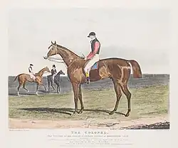 The Colonel returned to Yorkshire and did not run again before challenging for the St Leger at Doncaster in September. John Scott had another contender for the race in the talented but injury-prone colt Velocipede who had not been entered for the Derby. In a trial gallop shortly before the race, Velocipede decisively defeated The Colonel but sustained a leg injury in the process and appeared at Doncaster with his legs heavily bandaged.[11] Another leading fancy for the race was the filly Bessy Bedlam, the only horse to have beaten Velocipede. In a field of nineteen runners, The Colonel, ridden as usual by Bill Scott, started the 3/1 favourite ahead of Velocipede on 7/2. After the chaotic start to the 1827 St Leger the jockeys were warned by the racecourse officials that no misconduct would be tolerated and the race began in a fair and orderly manner. Scott positioned The Colonel in third or fourth place as Velocipede made the running from Bessy Bedlam. The filly was beaten before the straight, and when Velocipede weakened a furlong from the finish The Colonel took the lead pursued by the 35/1 outsider Belinda. In the closing stages The Colonel went clear and won easily by three lengths from Belinda, with Velocipede in third. Despite the apparently decisive nature of the victory, the Sporting Magazine considered the race to be an unsatisfactory one for at least two reasons: the Scotts were criticised for using Velocipede as a pacemaker rather than allowing him to compete on his own merits, and there were strong rumours that Bessy Bedlam had been prevented from showing her best form by some kind of "foul play".[12] Two days after his win in the St Leger, The Colonel was able to claim an uncontroversial victory when he was allowed to walk over in a sweepstakes over the same course and distance.[13]