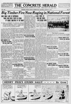 - ^ Dwelley wrote two contemporary accounts that put the date of this fire on March 13[17] and February 16,[18] but according to 1915 sources, the fire occurred on March 9,[19] as reported by The Concrete Herald itself.[20]