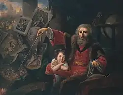 The Conjuror is a 1775 oil painting by the Irish artist Nathaniel Hone the Elder.[1] An allegory, it depicts a conjuror or alchemist casting a series of paintings by Old Masters into a fire and drawing a print from them. A bearded magician, he is seated with a young girl leaning against his knee. In the background is St Paul's Cathedral.[2]