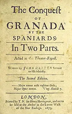 The Conquest of Granada by the Spaniards (1672), is a two-part tragedy by John Dryden about the Spanish conquest of Granada (1482–1491), and the fall of Muhammad XII of Granada, the last Nasrit ruler of the Emirate of Granada (1230–1492), in southern Iberia. As a stageplay from the period of the English Restoration (1660), The Conquest of Granada is an example of the heroic drama genre in which the playwright Dryden was a pioneer writer; the first performance of the play was in 1670 and the first publication of the play was in 1672.
