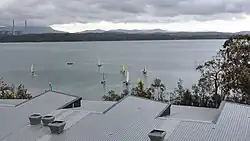 Sailing Boats belonging to CRU Lake Mac sailing on Lake Macquarie with Eraring Power Station in the background.