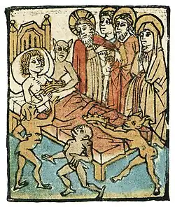 The Death of Captain Marvel invokes ideas that were presented in The Death of Ivan Ilyich by Leo Tolstoy, the first major work of death fiction in modernist literature. Mar-Vell's speech about the pain associated with dying invokes a similar passage written by Tolstoy.[26] Both stories end with an abstraction of death from the dying man's viewpoint as he discovers that death is not to be feared.[27] The story's themes also reflect the increasing prominence of death literature in the 1970s, including The Savage God by Al Alvarez, Mortal Lessons: Notes on the Art of Surgery by Richard Selzer, Life After Life by Raymond Moody, and A Way to Die by Victor and Rosemary Zorza.[13] Classic imagery associated with death is used extensively throughout The Death of Captain Marvel, including skulls, heartbeats, halos of light, reminiscence of a full life, and the deathbed. It also invokes Christian iconography in a secular fashion, such as that expressed by the 15th century Catholic texts on death, the Ars moriendi.[28]