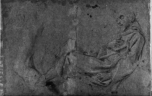 The first composition on the subject is recorded in a print after it by Gérard Audran, which is inscribed “Hannibal Carrache pinxit” ("Annibale Carracci painted [it]")[1] and a drawing after it by the Bolognese painter Aureliano Milani. No documents survive to date the work behind it or to elucidate its provenance and it is absent from all contemporary and early sources on Annibale. One autograph preparatory drawing for that painting does survive at the Royal Library in Windsor Castle, showing a reclining figure of the saint similar to that in the print.[2][3] The drawing was probably for a now lost painting by Carracci which Audran then reproduced.[3] One the reverse of the Royal Library drawing is a study of a nude young man, perhaps linked with plans for the Galleria Farnese. If so, this probably means the nude post-dates the Saint Francis study, with the latter produced about the same time as work began on the Galleria Farnese, that is, around 1597–1598.[3]