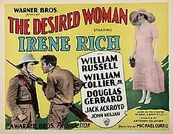 The Desired Woman is a 1927 American synchronized sound drama film directed by Michael Curtiz and starring Irene Rich, William Russell and William Collier Jr.[1][2] While the film has no audible dialog, it was released with a synchronized musical score with sound effects using the Vitaphone sound-on-disc process. It is now considered to be lost.[3][4] It was produced and distributed by Warner Bros. The film was based on a story by Darryl F. Zanuck, who was credited under the pseudonym Mark Canfield.