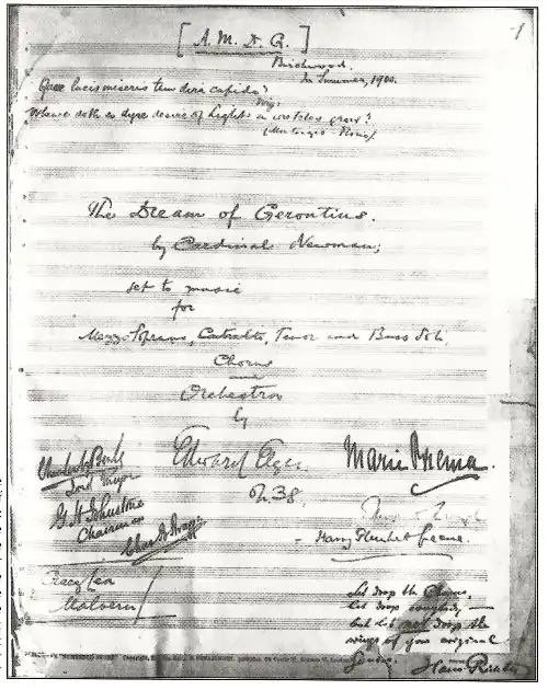 Composition proceeded quickly. Elgar and August Jaeger, his editor at the publisher Novello, exchanged frequent, sometimes daily, letters,[5] which show how Jaeger helped in shaping the work, and in particular the climactic depiction of the moment of judgment.[6] By the time Elgar had completed the work and Novello had printed it, there were only three months to the premiere. The Birmingham chorus, all amateurs, struggled to master Elgar's complex, demanding and somewhat revolutionary work. Matters were made worse by the sudden death of the chorus master Charles Swinnerton Heap and his replacement by William Stockley, an elderly musician who found the music beyond him.[7] The conductor of the premiere, Hans Richter, received a copy of the full score only on the eve of the first orchestral rehearsal.[8] The soloists at the Birmingham Festival on 3 October 1900 were Marie Brema, Edward Lloyd and Harry Plunket Greene.[9] The first performance was, famously, a near disaster. The choir could not sing the music adequately, and two of the three soloists were in poor voice.[10] Elgar was deeply upset at the debacle, telling Jaeger, "I have allowed my heart to open once – it is now shut against every religious feeling & every soft, gentle impulse for ever."[11] However, many of the critics could see past the imperfect realisation and the work became established in Britain[12][13] once it had had its first London performance on 6 June 1903, at the Roman Catholic Westminster Cathedral.[14][15] The work's first full performance (although using the revised text)[16] at the Three Choirs Festival was in Worcester in 1902, conducted by Elgar.[17]