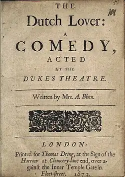 The Dutch Lover is a comedic play written by Aphra Behn, first performed and published in 1673.[1] It came out during the Third Anglo-Dutch War and is an example of wartime propaganda, seen most obviously in the ludicrous character of Haunce van Ezel, the 'Dutch lover' of the title.[2]