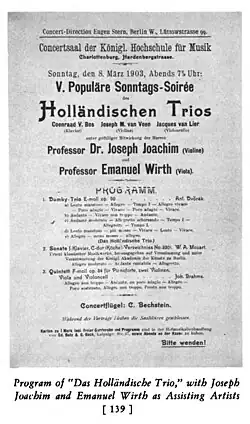 Van Veen had played with Bos since 1897 in a duo for piano and violin and with Van Lier in a string quartet. The three men united in 1899 to form "Das Holländische Trio".[1] They made their debut on April 28, 1899, in Berlin with a concert dedicated in its entirety to the works of Eduard Behm.[2] In the fall of 1899, they also made their debut in the Netherlands.[3]