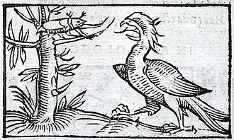 Hieronymus Osius also dealt with the subject in Latin verse, drawing the same moral,[7] and also told the story at greater length in his Phryx Aesopus (1564).[8] In both cases the story is told of a dung-beetle (scarabaeus), as it was by La Fontaine in his Fables (L'Escarbot et l'aigle, II.8). In this the beetle is brought to trial by Zeus and convinces the god that it is in fact avenging the crime of lèse majesté. All Zeus can do is change the breeding time of the eagle to one when the beetle is hibernating.[9]