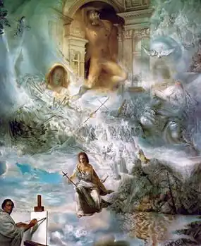Salvador Dalí was 54 years old when he began to paint The Ecumenical Council. He was established as a surrealist with a reputation for shocking audiences with fantastic imagery, something that New York Times chief art critic John Canaday later characterized as "the naughtiness that obsessed him".[1] His work began to take on darker, more violent overtones during World War II.[2] Possibly spurred both by the death of his father in 1950 and his interest in the writings of French theologian Pierre Teilhard de Chardin, Dalí began to incorporate religious iconography in his work.