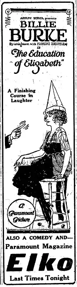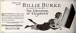 The Education of Elizabeth is a 1921 American silent comedy romance film produced by Famous Players–Lasky and distributed by Paramount Pictures. It was directed by Edward Dillon and stars stage star Billie Burke in her last silent film. The film was based on a play by Roy Horniman and is now a lost film.[1][2][3]