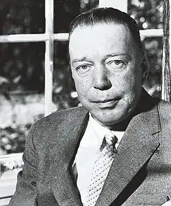 In April 1945 Waltari travelled to his mother-in-law's cottage in Hartola, where he began writing in the attic.[24] The experiences of war and 20 years of research had pushed him into a state where the novel burst out of him: The novel was written within a three and a half-month period of great inspiration, with Waltari producing as many as between 15 and 27 sheets per day.[16] So intense was his state of inspiration and immersion that, in a fictionalised account called A Nail Merchant at Nightfall he would write later, he claimed to have been visited by visions of Egyptians and to have simply transcribed the story as dictated by Sinuhe himself. He repeated the same story four decades later in Kirjailijan muistelmia.[25] This has caused some to speculate that Waltari in fact had been an Egyptian in a prior life or was a reincarnation of Sinuhe.[25] Waltari followed a consistent schedule, writing from 9 AM to 4 or 5 PM, meal breaks at predetermined times, family members leaving him to his work.[26] A state of happiness and being in love during creative work was essential to Waltari, and on evenings he wrote long love letters to one Helena Kangas (later known as Leena Ilmari) throughout the summer.[27][28] Waltari's extramarital relationships were no danger to his marriage, as he and his wife Marjatta had developed a mutual understanding regarding these matters and Waltari would always remain loyal to her in the end.[29][30] His mother died during this; his wife managed the funeral arrangements, Waltari attended the funeral, and on the next morning he resumed writing the novel where he left off.[16]