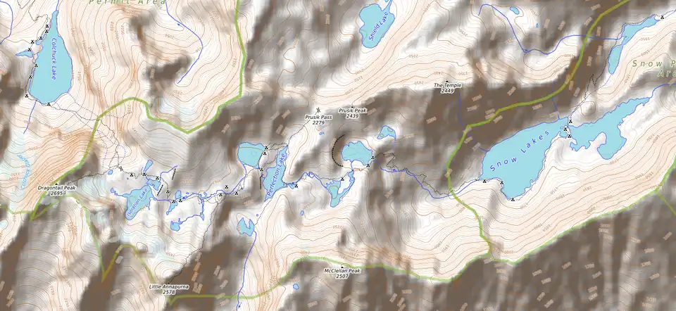 The elevation of The Enchantments range from 5,000 feet (1,500 m) at Nada Lake to 7,800 feet (2,400 m) in the Upper Enchantments to 8,840 feet (2,690 m) at the summit of Dragontail Peak.[9][10] The treeline is approximately 6,400 feet (2,000 m) above Snow Lake.[9] The EPA ecoregion below the treeline is 77g, "Wenatchee/Chelan Highlands", dominated by Douglas fir, Grand fir, and Subalpine fir. Lodgepole pine, Engelmann spruce, and vine maple are also present.[11][5] Slide alder grows in avalanche chutes.[5]