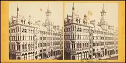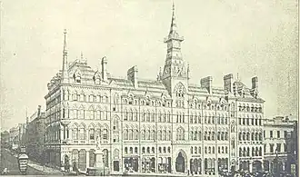 The building was constructed from honey-coloured Hollington stone.[6] Its architectural style was Gothic.[7] It had a frontage of 64 feet (20 m) onto New Street and 186 feet (57 m) onto Stephenson Place, and was adjacent to Birmingham New Street railway station.[2]