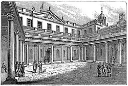 When finished in 1743 the Exchange, as planned, had "the outward appearance of one grand structure,” and the much-admired exterior remains today largely as built.[2] The front of the building has Corinthian columns in the centre and pilasters to the sides. A central semicircular-arched doorway has cast-iron lion-head knockers. A frieze with human and animal heads symbolises trade, and a Royal Coat of Arms is displayed in the tympanum. The rear of the building is symmetrical with pedimented windows and semicircular ground-floor arches.[1]