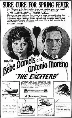 The Exciters is a 1923 American silent romantic comedy film produced by Famous Players–Lasky and distributed through Paramount Pictures. It is based on a 1922 Broadway play of the same name by Martin Brown. This film was directed by Maurice Campbell and stars Bebe Daniels, then a popular Paramount contract star.[1][2] On the Broadway stage, Bebe Daniels's role of Ronnie Rand was played by Tallulah Bankhead.[3]