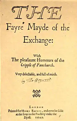 - Heywood, Thomas. The Fayre Mayde of the Exchange: with pleasant humours of the Cripple of Fanchurch. London, 1607. Text Creation Partnership digital edition. Early English Books Online. Web. 4 October 2012.