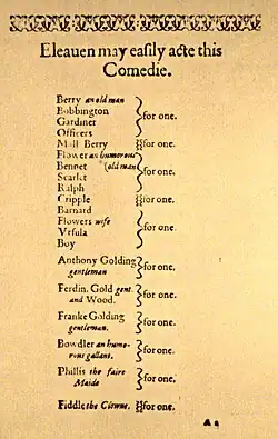 Stage direction at various parts of the play (e.g. Fight and beat them away at line 101, and Give them the letters and they stampe and storme at line 2130) strongly suggests that the play was performed.[6] Additionally, the division of 'dramatis personae' into 'Eleaven [who] may easily acte this comedie' is perhaps indicative of the 'division of labour' which would have been required for a travelling troupe. It is a possibility, then, that Thomas Heywood wrote the play for the purposes of performing it with his travelling company – Worcester's Men.[10] Nevertheless, no extant record of performance exists for this drama.