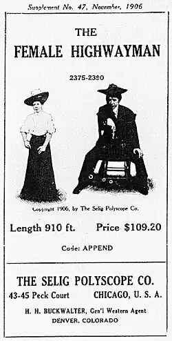 - ^ a b c "The Female Highwayman", Selig Polyscope Company (Chicago), Film Supplement, number 47, November 1906, 6 pp.; Edison Collection, I-098, Rutgers University, Piscataway, New Jersey. Retrieved July 12, 2020.
