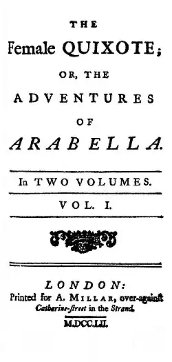 The Female Quixote; or, The Adventures of Arabella is a comedic novel by Scottish writer Charlotte Lennox imitating and parodying the ideas of Miguel de Cervantes' Don Quixote. Published in 1752, two years after she wrote her first novel, The Life of Harriot Stuart, it was her best-known and most-celebrated work. It was approved by both Henry Fielding and Samuel Richardson, applauded by Samuel Johnson, and used as a model by Jane Austen for Northanger Abbey.[1] It has been called a burlesque, "satirical harlequinade", and a depiction of the real power of females.[2] While some dismissed its protagonist Arabella as a coquette who simply used romance as a tool, Scott Paul Gordon said that she "exercises immense power without any consciousness of doing so".[3] Norma Clarke has ranked it with Clarissa, Tom Jones and Roderick Random as one of the "defining texts in the development of the novel in the eighteenth century".[4]