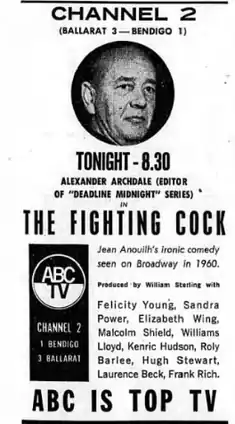 The Fighting Cock is a 1963 Australian television play. It is an adaptation of a play by Jean Anouilh whose original French title was L'Hurluberlu. In English, it had a run on Broadway, starring Rex Harrison.[4][5]