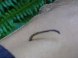 The blood worm (Pacet) is common in the forest. This leech does not live in water but crawls everywhere on land and trees, not unlike the worm or caterpillar, in search of animals (including people) to feed on.