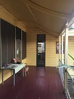 The front (north) verandah is open to the view and the northern verandah wall is symmetrical, retaining original step-through double-hung windows either side of an entrance door. Parts of the east, west, and south verandahs have been enclosed (in stages, likely pre-1906) to form a number of smaller interconnected rooms and some have had the verandah wall demolished and the enclosed verandah incorporated into the core.[1]