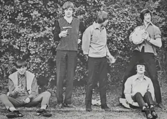 ![]() The Fortunes in early 1966. From left: David Carr, Glen Dale, Barry Pritchard, Andy Brown (standing), Rod Allen (seated) | |