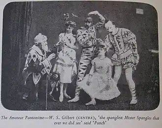 The story of Ali Baba and the Forty Thieves was a popular subject for pantomime. This entertainment was first produced at the Gaiety Theatre by its proprietor, John Hollingshead (also a member of the Club), as the Wednesday matinee on 13 February 1878.[2] Robert Soutar (Nellie Farren's husband) acted as director/stage manager, with John D'Auban choreographing the Harlequinade that was played at the end of the pantomime. Meyer Lutz conducted the music.[3] Hollingshead secured the services of the professional female actors, the male amateur actors, the distinguished writers,[4] Hollingshead later remembered, "[T]he gem of the performance was the grimly earnest and determined Harlequin of W. S. Gilbert. It gave me an idea of what Oliver Cromwell would have made of the character."[5]