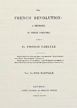 The French Revolution: A History was written by the Scottish essayist, historian and philosopher Thomas Carlyle. The three-volume work, first published in 1837 (with a revised edition in print by 1857), charts the course of the French Revolution from 1789 to the height of the Reign of Terror (1793–94) and culminates in 1795. A massive undertaking which draws together a wide variety of sources, Carlyle's history—despite the unusual style in which it is written—is considered to be an authoritative account of the early course of the Revolution.