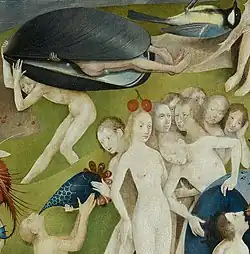 To their right, a knight with a dolphin tail sails on a winged fish. The knight's tail curls back to touch the back of his head, referencing the common symbol of eternity: the snake biting its own tail. On the immediate right of the panel, a winged youth soars upwards, carrying a fish in his hands and a falcon on his back.[40] According to Belting, in these passages, Bosch's "imagination triumphs ... the ambivalence of [his] visual syntax exceeds even the enigma of content, opening up that new dimension of freedom by which painting becomes art."[15] Fraenger titled his chapter on the high background "The Ascent to Heaven" and wrote that the airborne figures were likely intended as a link between "what is above" and "what is below," just as the left and right-hand panels represent "what was" and "what will be."[41]