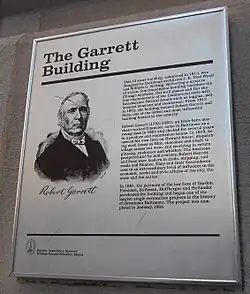 Robert Garrett was an Irish immigrant and merchant who came to Baltimore in 1801 and opened his financial firm in 1819. His son, John W. Garrett, was an American banker, philanthropist, and president of the Baltimore and Ohio Railroad (B&O), whose support for the Union was critical in the Civil War. He was a close confidante of Johns Hopkins and George Peabody. Robert Garrett's great-grandson, Robert Garrett was an Olympic athlete and prominent in Baltimore civic life in the 20th century. Robert Garrett & Sons resided there until 1974 when it merged with Alex. Brown & Sons.