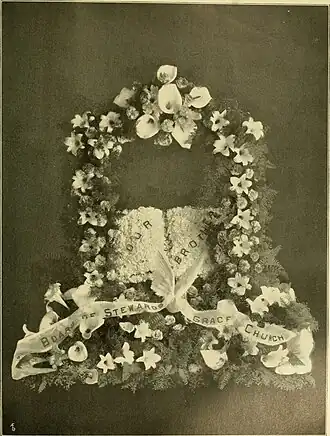 In September 1881 a stunned nation responded to the assassination of United States President James A. Garfield with ornate floral displays and long lines of mourners. A Boston paper noted "A beautiful representation of the gates ajar was made rosebuds and smilax."[43] A reporter from Akron, Ohio commented on the "beautiful floral offerings" as the President lay in state: "Next is a representation of the gates of Heaven, one of which is ajar. The pillars are beautifully formed of white and purple blossoms, and the gates of evergreen."[44] Gates Ajar funeral bouquets are still available and now described by florists as "traditional".[45]