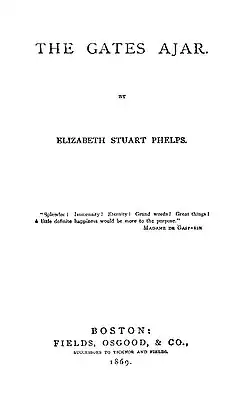 The Gates Ajar is an 1868 religious novel by Elizabeth Stuart Phelps (later Elizabeth Phelps Ward) that was immensely popular following its publication. It was the second best-selling religious novel of the 19th century.[2] 80,000 copies were sold in America by 1900; 100,000 were sold in England during the same time period.[3] Sequels Beyond the Gates (1883) and The Gates Between (1887) were also bestsellers, and the three together are referred to as the author's "Spiritualist novels."[4]