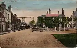 Also by this time, the former gallows had been converted into an inn sign that soon became a landmark,[19][31] and some structural and exterior alterations were made—the first of many over the subsequent years.[36] The earliest known photograph of the George, dated 1867, shows a dilapidated building of several uncoordinated parts: it had expanded over the years to take in buildings on each side of the original medieval inn, and it was considered a purely functional building with no obvious architectural merit.[37] By this time, the coaching era was in terminal decline because of the increasing popularity of rail travel; a line was opened between London and Brighton in 1841, with a station at Three Bridges just east of Crawley,[38] and the town centre received its own branch line and station in 1848.[39] Despite this, Crawley High Street remained busy as the town continued to grow, and The George underwent more renovation and was extended further. In particular, an old (possibly 18th-century) free-standing building which stood in the middle of the wide High Street, and which was once used as a candle factory, was acquired by the George's owners and became an annex.[40][41] It was this building, rather than the main part of the hotel, which accommodated Queen Victoria when she was forced to stay overnight.[34] Cycling for leisure purposes became a fad in the late 19th century, and the London–Brighton road was a popular route; the George became a regular stopping point for groups of cyclists.[42]