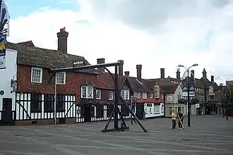 Major changes took place in the 1930s. The annex was knocked down in 1933,[40] and the site in the middle of the High Street was converted into a bus stop and a car park for the hotel[43][44] (itself removed since the street's pedestrianisation in the early 21st century). The gallows sign was replaced with a replica, and two smaller facsimiles were added in the car park, which was also flanked by four medieval-style lanterns.[44][45] Meanwhile, wide-ranging renovations to the hotel itself made the building look even older than it did before; all structural changes took its medieval character into account and were made in a complementary style,[45][46] making all the disparate parts of the hotel "look an integrated whole".[28]
