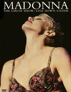 Initially, Madonna intended to film the tour in Argentina or Mexico, but she ultimately chose Australia instead, as she liked the event being billed as "Madonna Down Under".[7] The show on November 19, 1993, at Sydney Cricket Ground was aired on HBO on November 21, 1993, as Madonna Live Down Under: The Girlie Show. HBO started its broadcast from Club USA in New York City, leading to the concert itself.[8] The program became the company's most-watched original program of the year.[9] The video was released on VHS and Laserdisc on April 26, 1994, under the title The Girlie Show: Live Down Under.[10][11] In 1998, it was released on DVD, becoming one of the first video albums to be published in this format.[12] The music video appears in an aspect ratio of 1.33:1 (4:3) on the single-sided, single-layered DVD, featuring "bright and vivid" colors.[13] In addition to this release, the concerts in Fukuoka were filmed for a Japanese television special,[14] while British radio station BBC Radio 1 broadcast the entire second show at Wembley Stadium on December 26, 1993.[15]