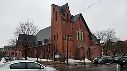 In June 1891, the first electric street car set off down Bank Street for the Exhibition, which opened at Lansdowne Park in 1888. First Avenue Public School and St. Matthew's Anglican Church, then a small frame structure, opened their doors about the same time in 1898. Mutchmor Public School on Fifth Avenue was built in the 1890s with additions in 1911 and 1920 as housing density increased and new families moved into the district. The separate school, Corpus Christi, also dates from this early era. Roman Catholic families attended Mass for some years to a temporary chapel on the south side of Fourth Avenue near Percy.[4] In 1900, the Ottawa Electric Street Railway was established, with one of its first routes running south along Bank Street. The Drive way, from Elgin Street and Laurier Avenue over the route to the Experimental Farm, was built between 1900 and 1903, providing added impetus to city growth on the south side. Most Glebe houses (which were largely built before 1914) date from this era, and the area became home to many middle-class workers. As housing went up on the avenues, corner stores and other commercial properties began to appear on Bank Street. The electric street car allowed workers to live in the Glebe and take the street car to work. As part of this building program, Clemow and Monkland Avenues were laid out and Clemow Avenue was paved west from Bank Street. From 1903-1904, a large low-lying area between Second and Third Avenues was filled in with sand taken from the land along Carling Avenue.[4] Growth was slower on the blocks west of Bank Street, and housing did not extend much beyond Kent Street.