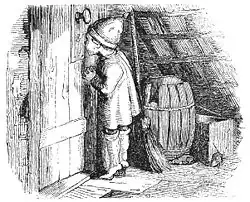 Once, a student lived in an attic while a grocer lived on the first floor with a nisse, or house goblin. Because the grocer treated the nisse for Christmas with a dish of porridge (Danish: fad grød) with a large lump of butter in the middle, the nisse was attached to the grocer.[12][15] One day, the student came to buy cheese and candles; then he discovered that his cheese was wrapped in a page from a poetry book, so he bought the book instead of the cheese, and joked that the grocer knew nothing about poetry. The goblin, offended by the joke, used magic to make everything in the room speak and they all agreed that poetry was useless. The goblin went to tell the student, but he saw a beautiful, marvelous tree of light in the student's room, the most splendid thing he had ever seen. He kept going back to watch the tree of light through the peephole, but could not stay there, for the grocer gave him jam and butter. One day when there was a fire, the red-capped nisse ran to save the poetry book, and realized that he thought the book the greatest treasure in the house. Still, he decided to divide his time between the grocer and the student, because the student provided no Christmas porridge (Julegrød).[16][12][7]