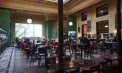 The building was unoccupied between 2010 and 2021, with windows and doors boarded up and elevations disfigured by graffiti. The building was included in the 2018 Heritage at Risk Register by Leeds Civic Trust, where it was given 'vulnerable' status.[1] The current owner, JD Wetherspoon, put forward proposals for conversion into a pub and hotel which were locally controversial, with the project facing a planning enquiry and licensing difficulties.[2] Planning permission and an alcohol licence were granted by the City Council in 2020,[3] and the building was converted into a large pub, named The Golden Beam after a painting by Atkinson Grimshaw, which opened June 2021.[4]